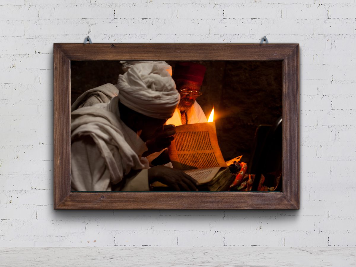 Bracia zakonnicy żyjący w Lalibeli podczas wieczornych modlitw. Lalibela, Etiopia.